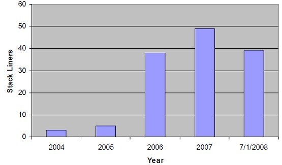 表3-1:最近幾年美國玻璃鋼煙囪的建造數(shù)量[10]